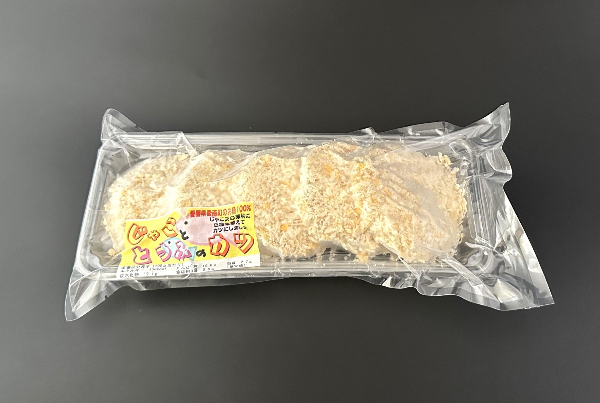 愛南町でとれる魚で作ったじゃこ天に豆腐を加えた「じゃこと豆腐のカツ(プレーン)」。油でさっと3~4分揚げるだけの簡単調理で、手軽に一品ができ上がります。ヘルシー志向の方やお子様にも人気の商品です。